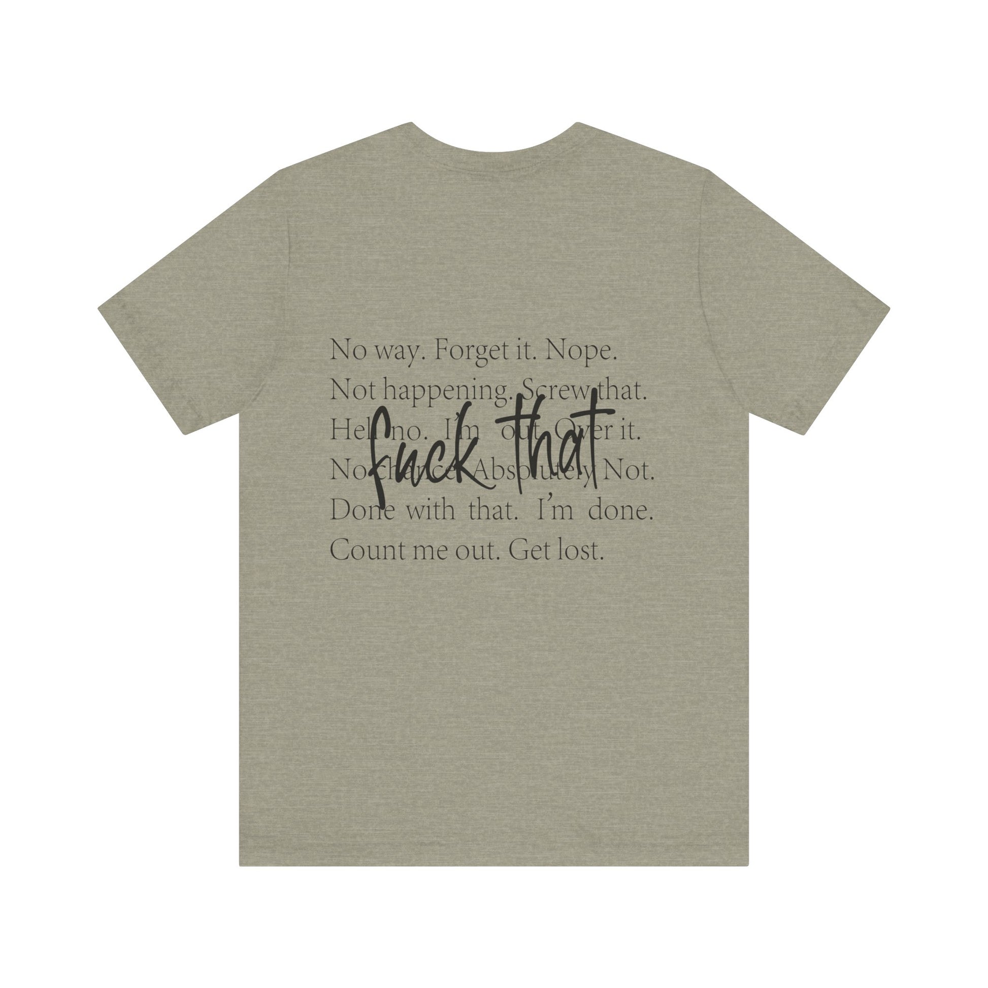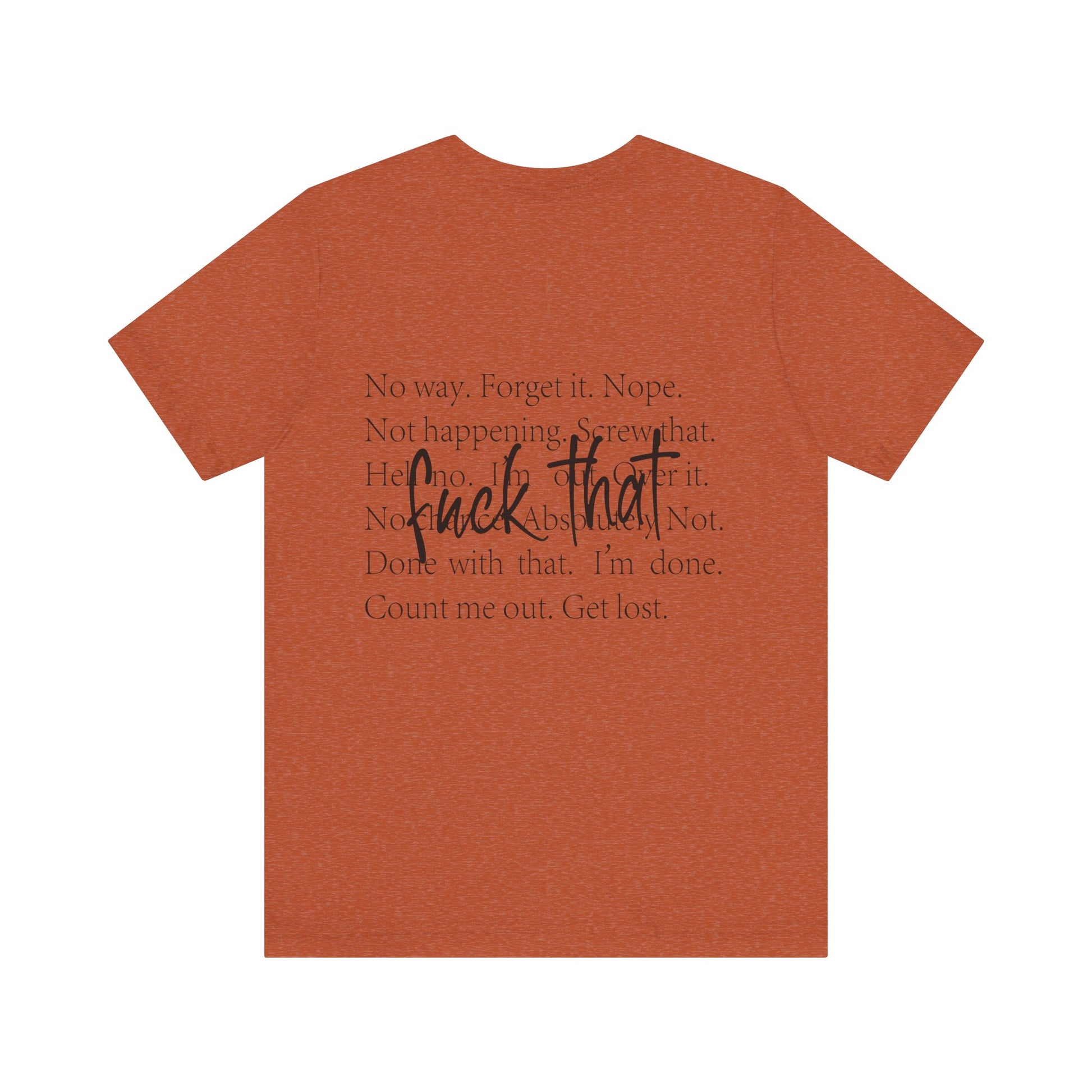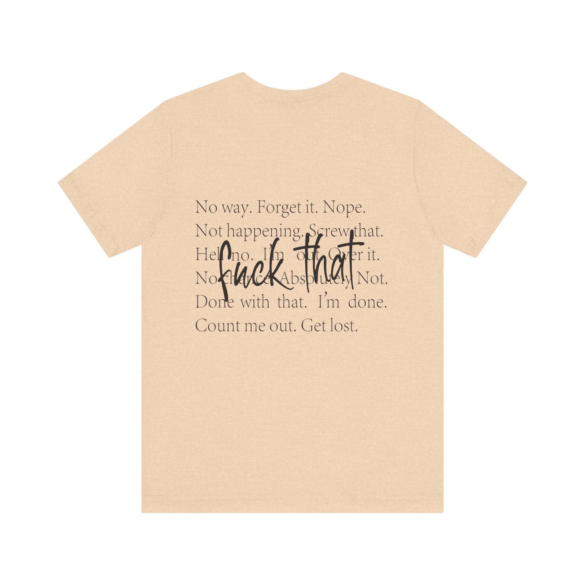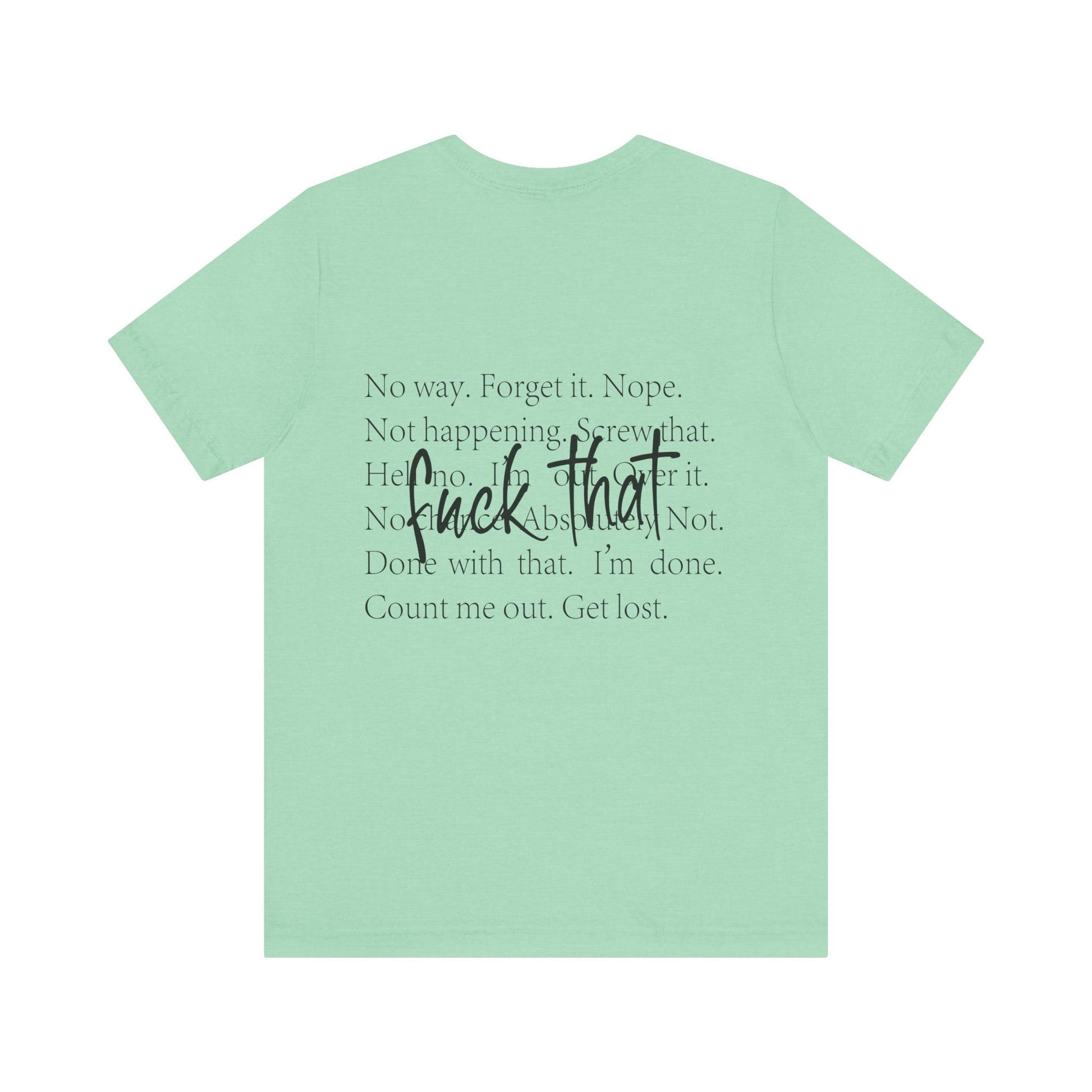 For those moments when a simple 'no' just doesn’t adequately capture the depth of your refusal. This shirt is the ultimate mood board for anyone who’s over it, done, and not afraid to say it—loudly, repeatedly, and with flair. Featuring a tasteful collection of ways to say 'nah,' elegantly interrupted by one bold, unfiltered sentiment: 'F*ck that.' Perfect for work meetings, family gatherings, or anytime someone dares to ask you to do... literally anything."