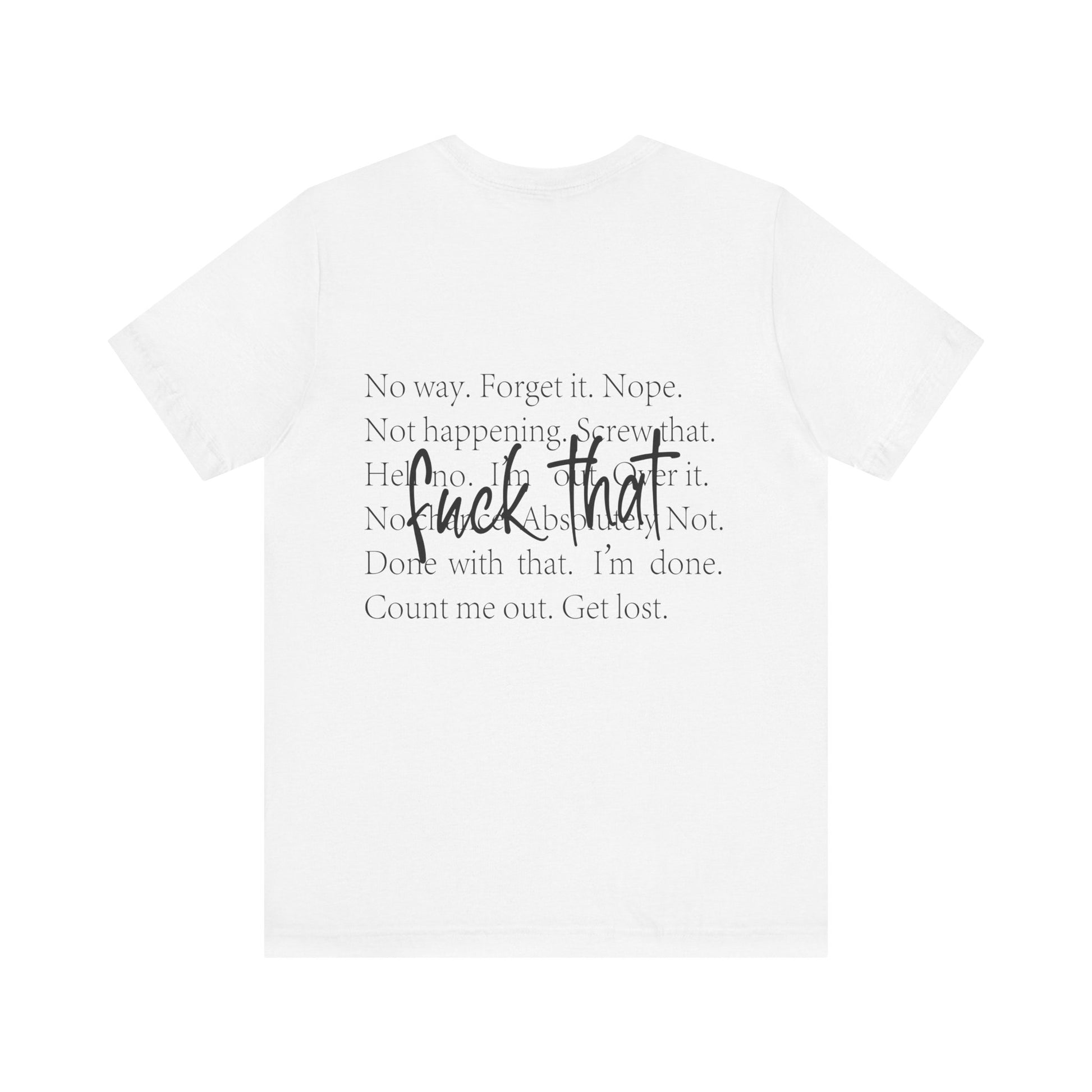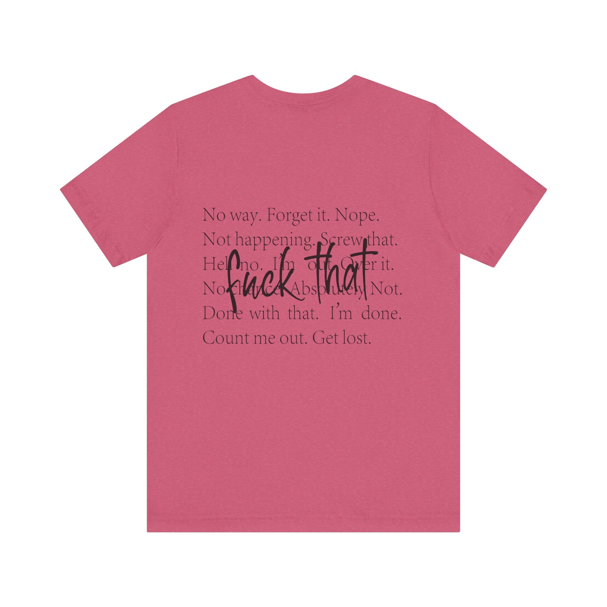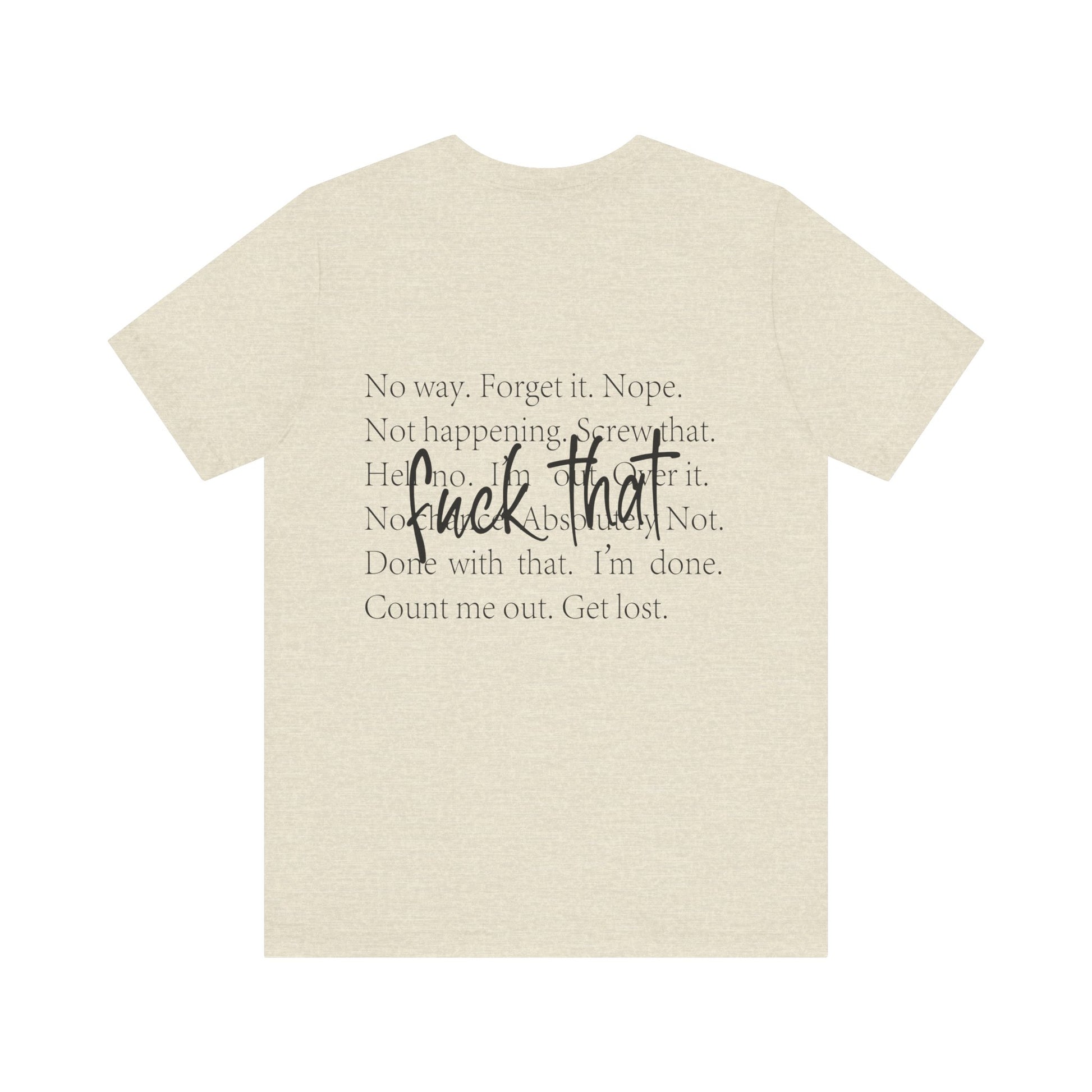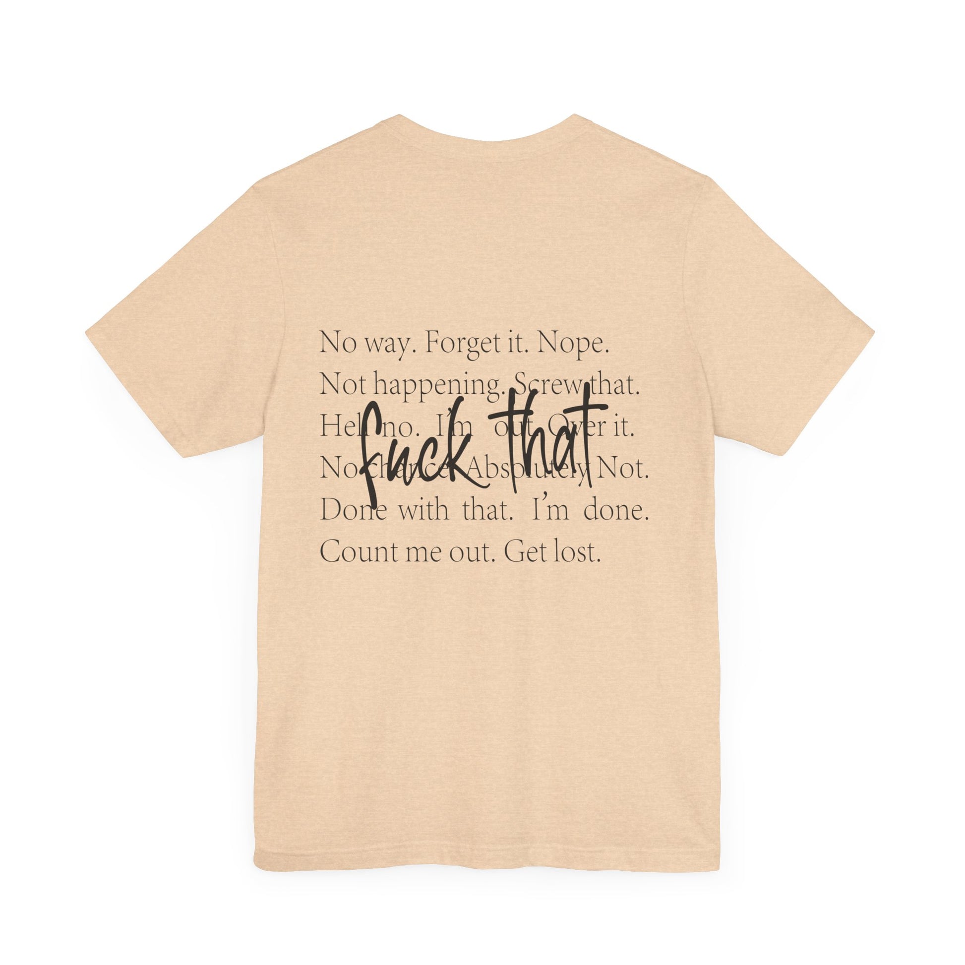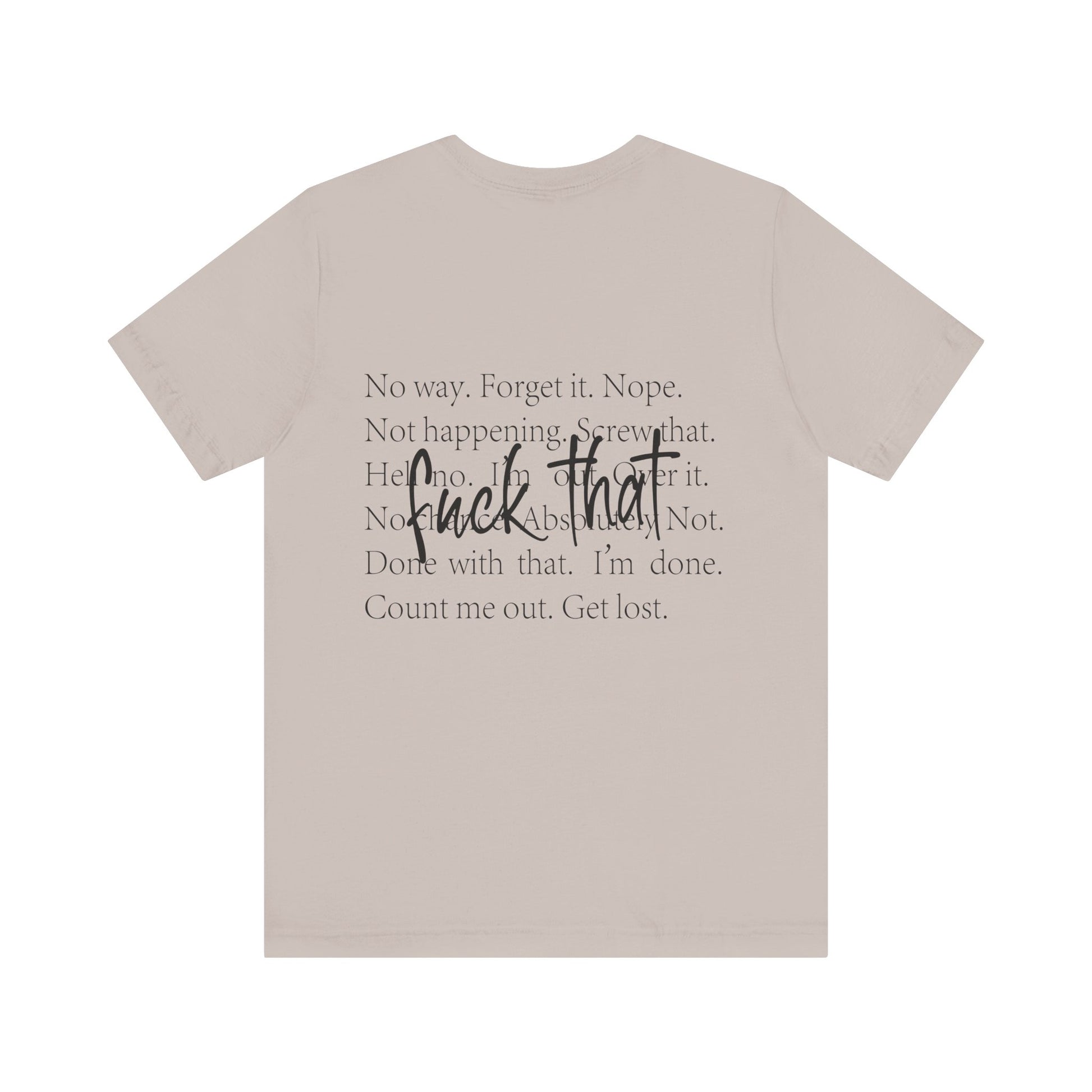 For those moments when a simple 'no' just doesn’t adequately capture the depth of your refusal. This shirt is the ultimate mood board for anyone who’s over it, done, and not afraid to say it—loudly, repeatedly, and with flair. Featuring a tasteful collection of ways to say 'nah,' elegantly interrupted by one bold, unfiltered sentiment: 'F*ck that.' Perfect for work meetings, family gatherings, or anytime someone dares to ask you to do... literally anything."
