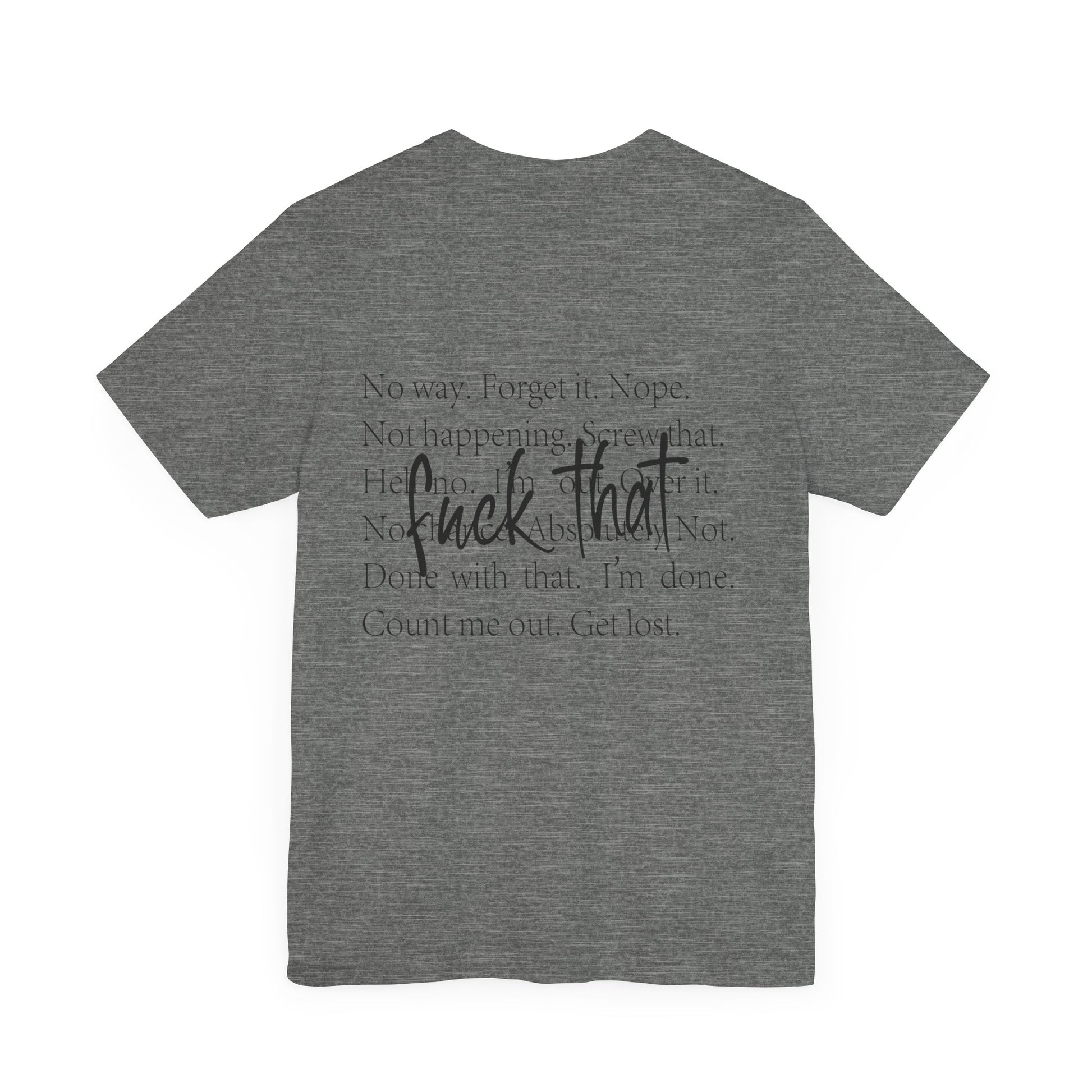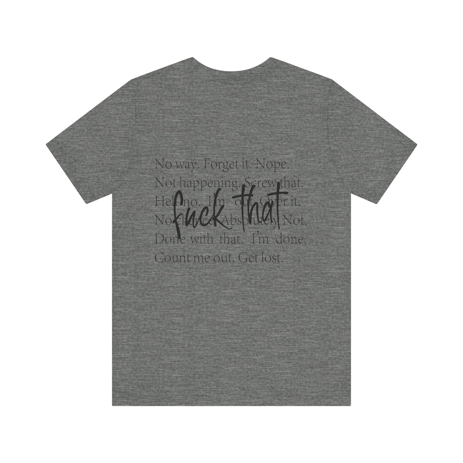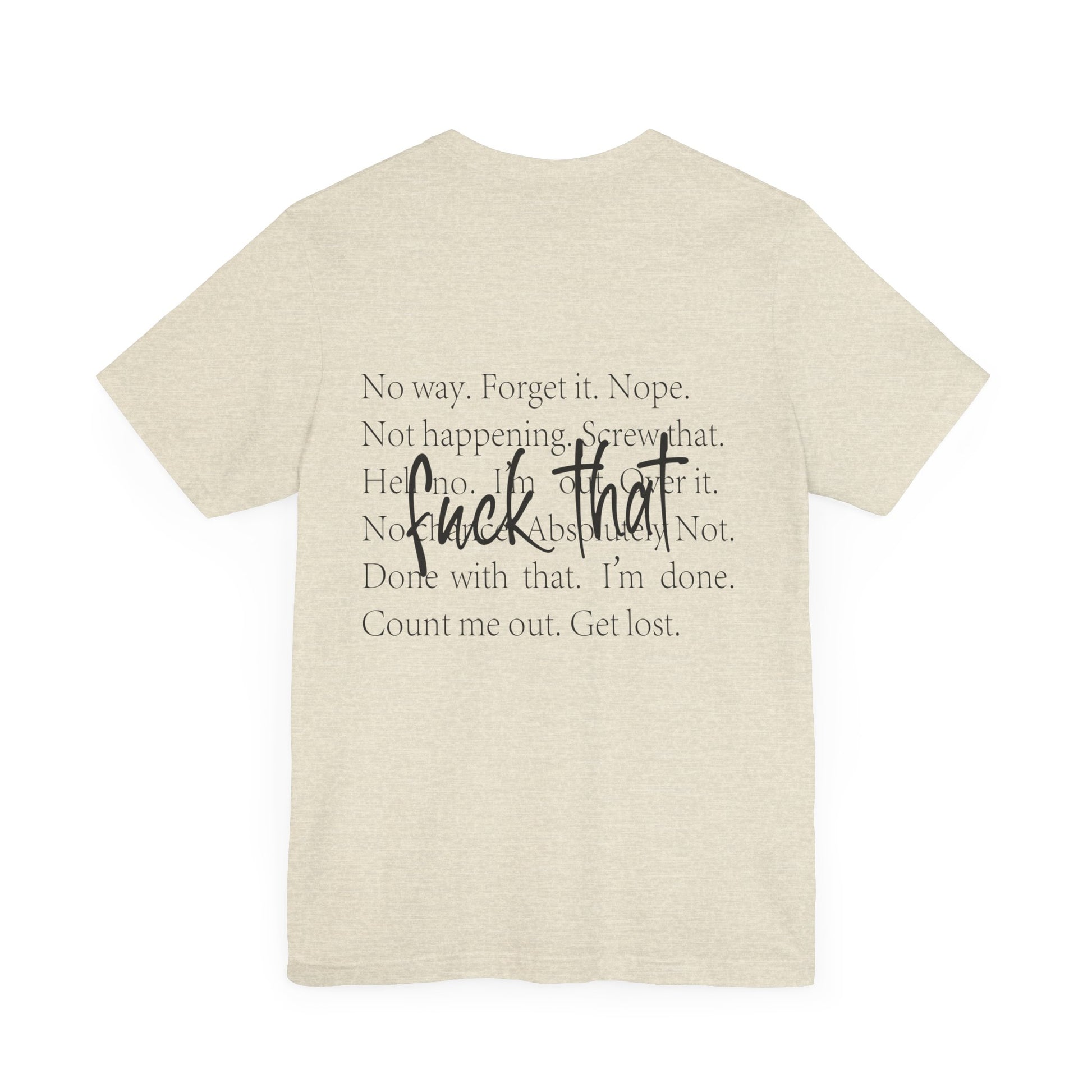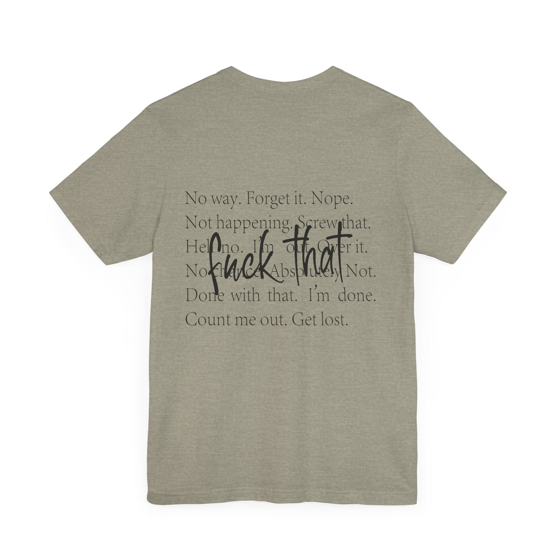 For those moments when a simple 'no' just doesn’t adequately capture the depth of your refusal. This shirt is the ultimate mood board for anyone who’s over it, done, and not afraid to say it—loudly, repeatedly, and with flair. Featuring a tasteful collection of ways to say 'nah,' elegantly interrupted by one bold, unfiltered sentiment: 'F*ck that.' Perfect for work meetings, family gatherings, or anytime someone dares to ask you to do... literally anything."