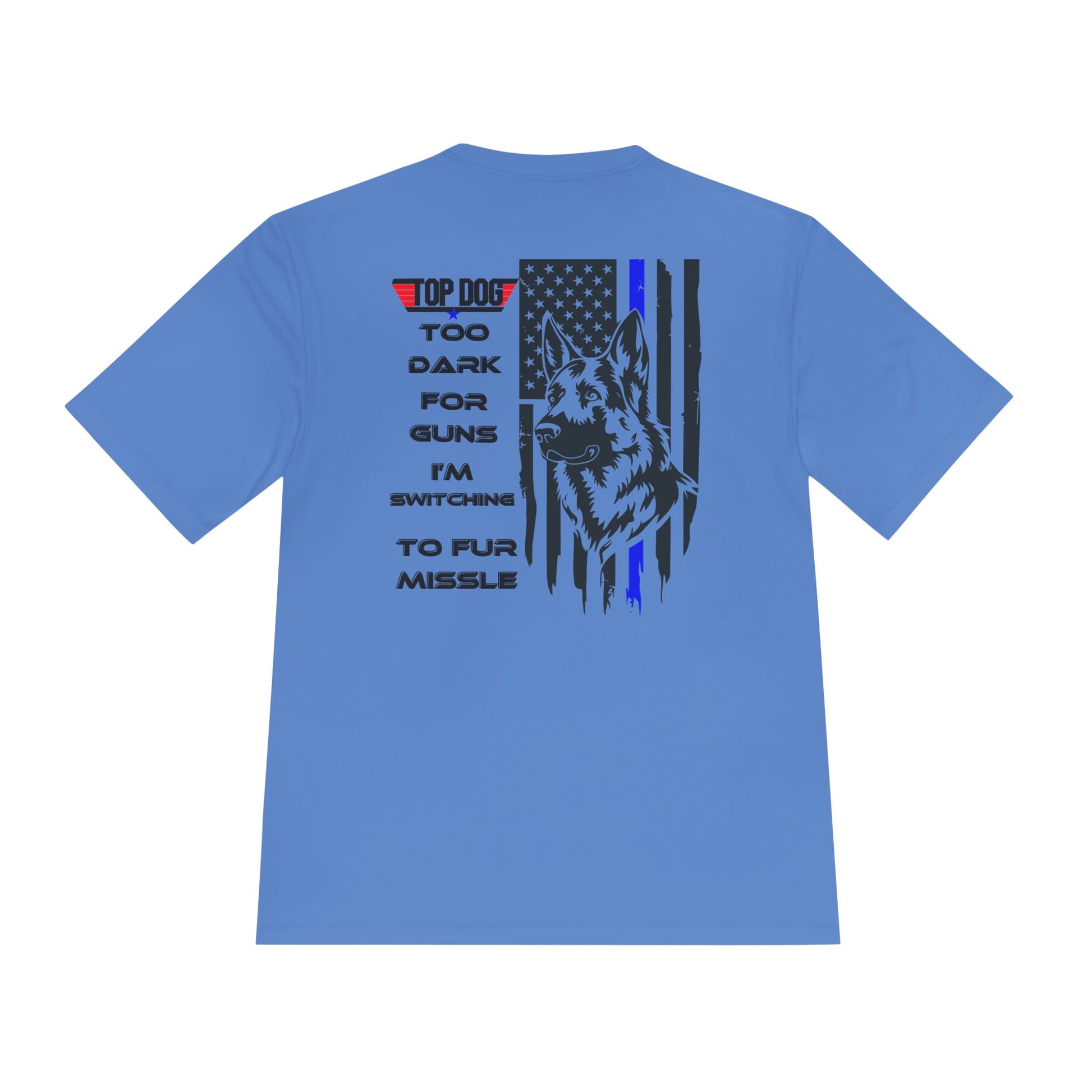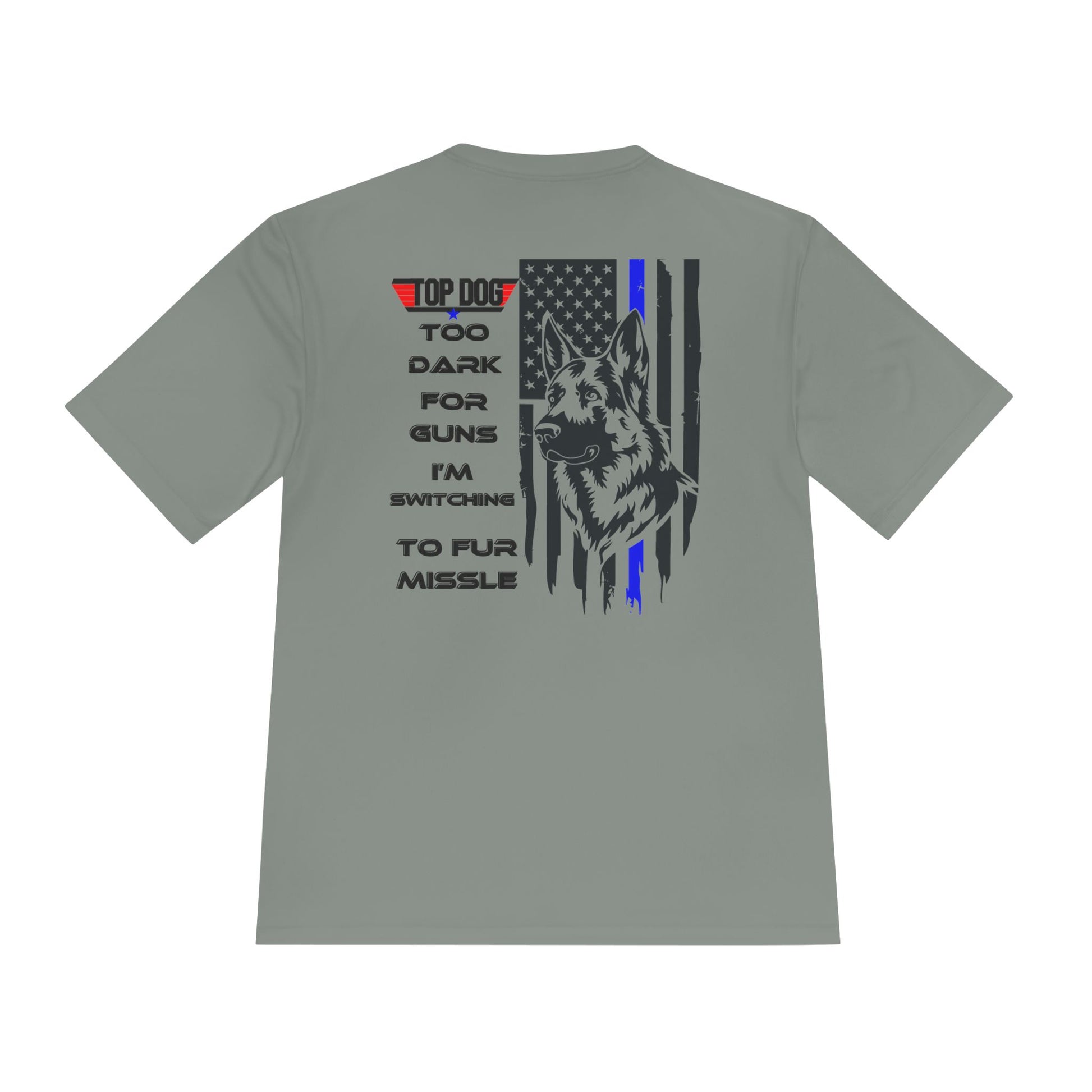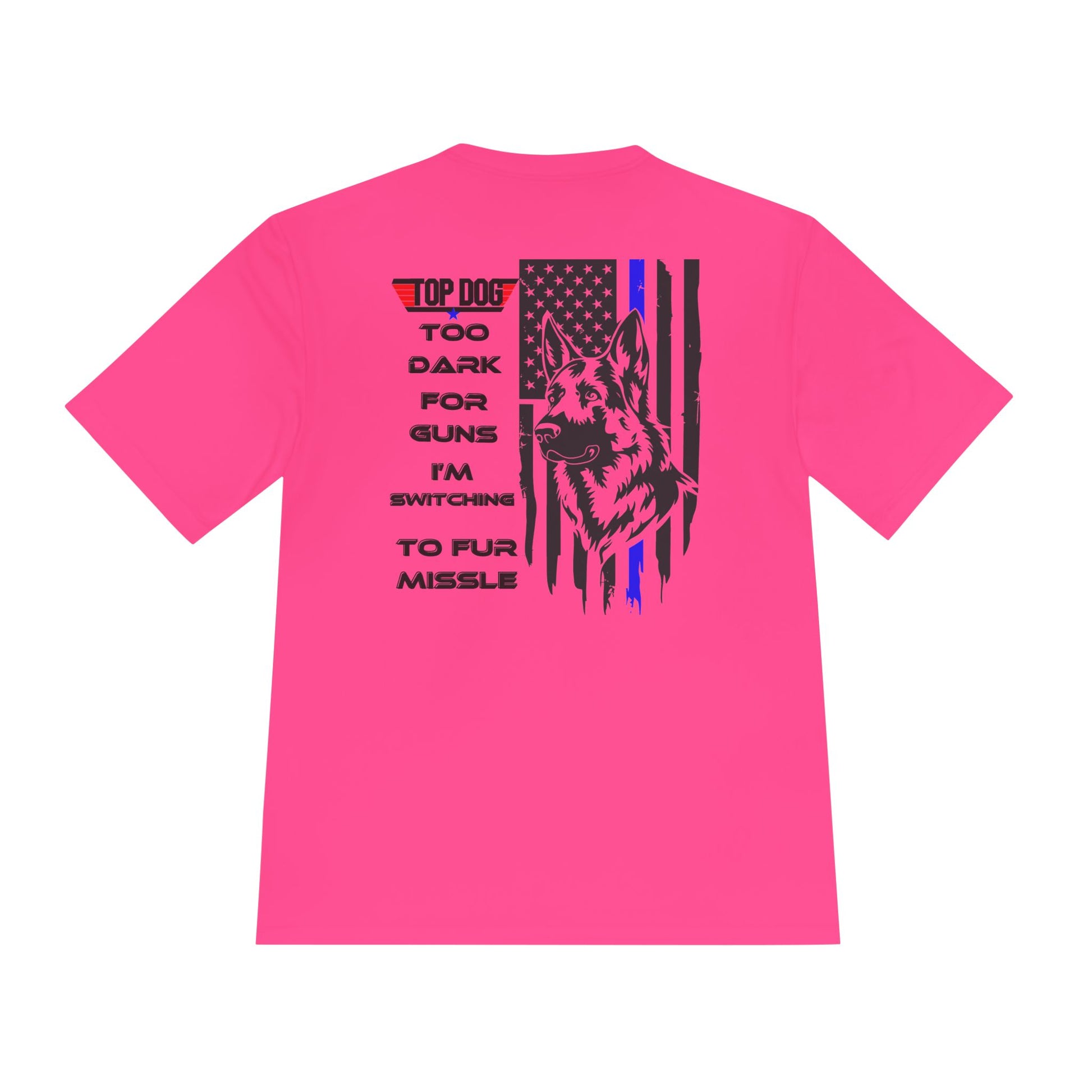 It’s Too dark for Guns, Switching to Fur Missile' tee! Moisture Wicking Tee - 'Top Dog' Graphic Shirt