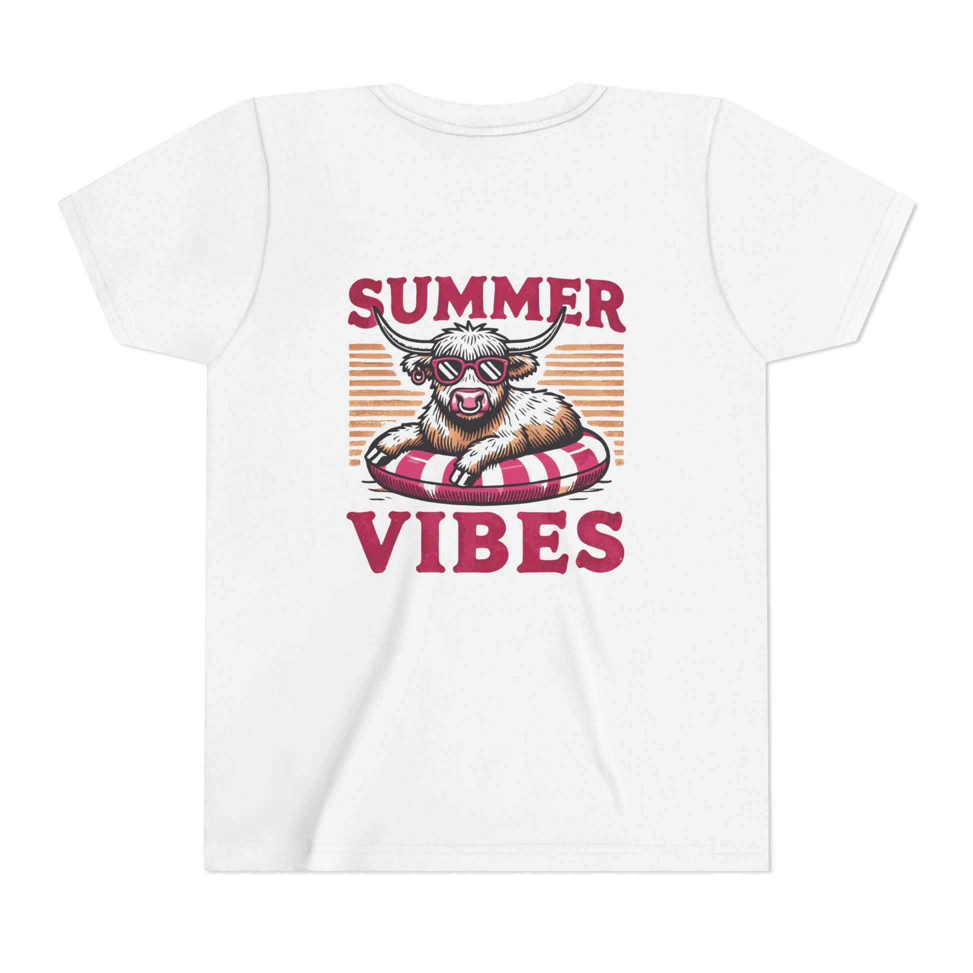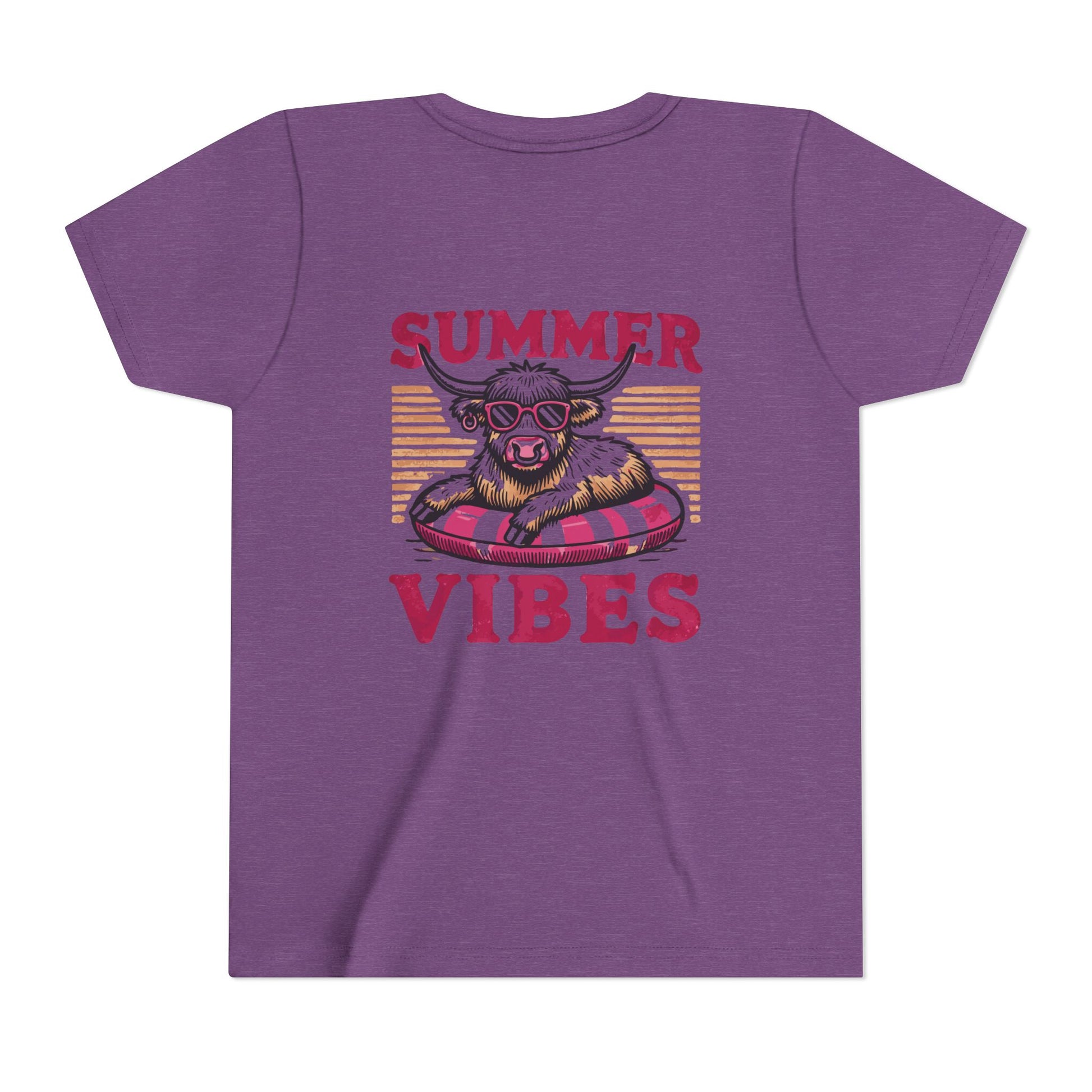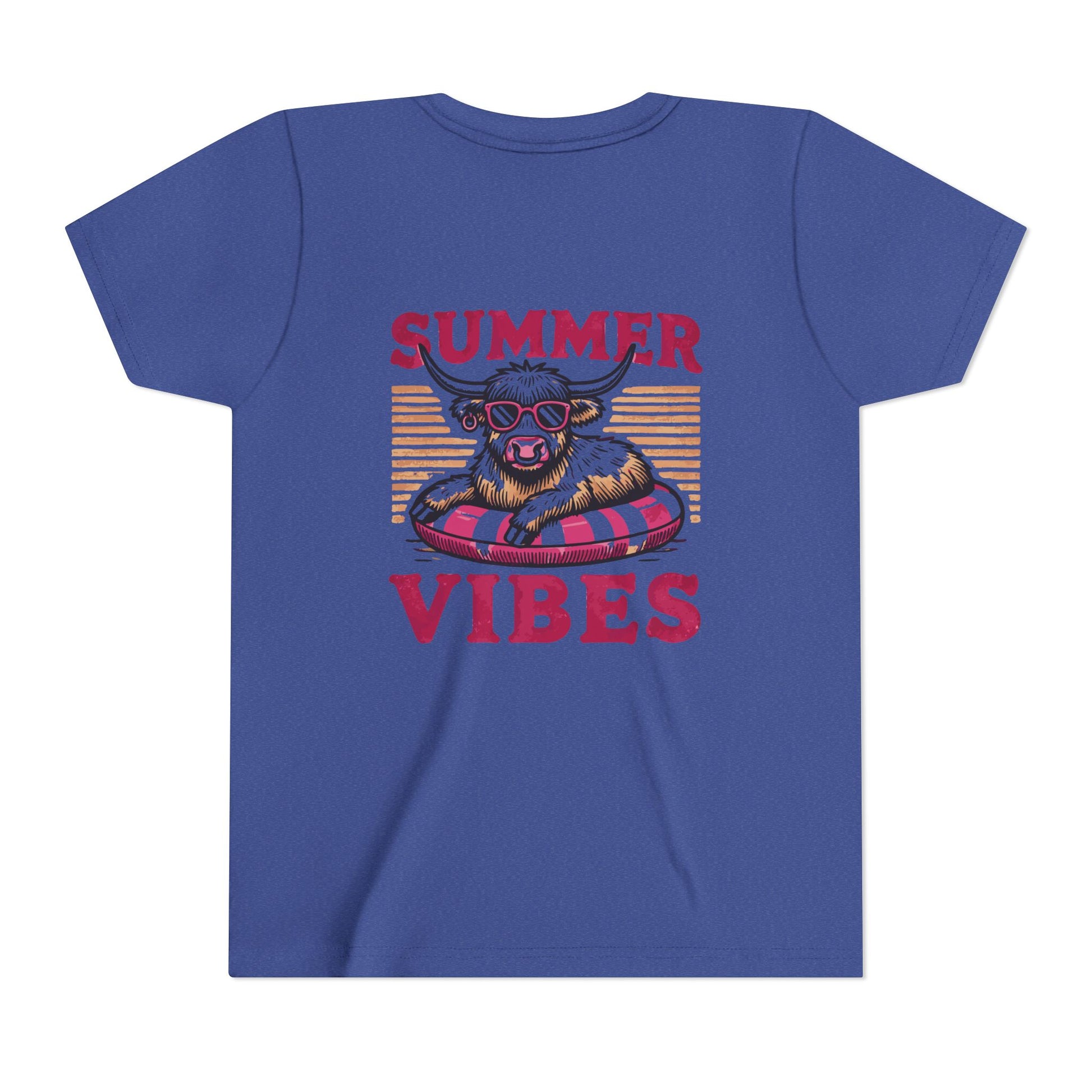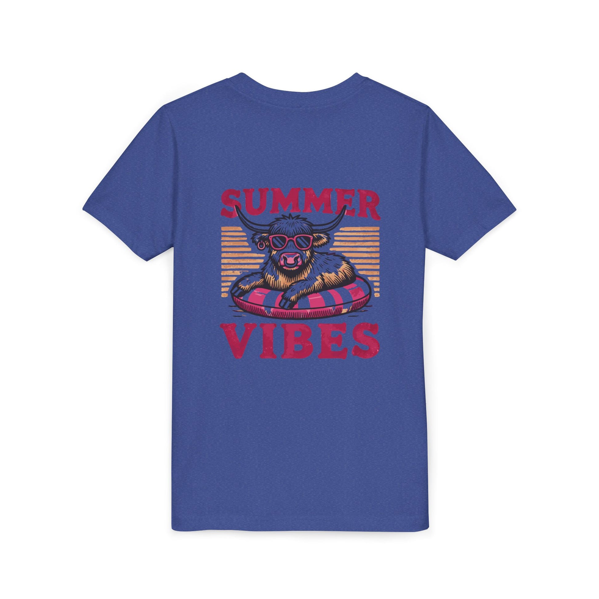 "Kick back and soak up the sunshine with our 'Summer Vibes' tee! Featuring a chill cow lounging on an inflatable, it's your perfect partner for lazy days and breezy adventures. Embrace the moo-d of the season!" will love this custom youth short-sleeve tee. This lightweight side-seamed shirt maximizes comfort all day long. The ring-spun cotton makes this kids' short-sleeved tee perfect for displaying custom artwork. Side seams keep the garment's shape. The shoulders have tape for longer fitting. The collar is extra elastic due to ribbed knitting.