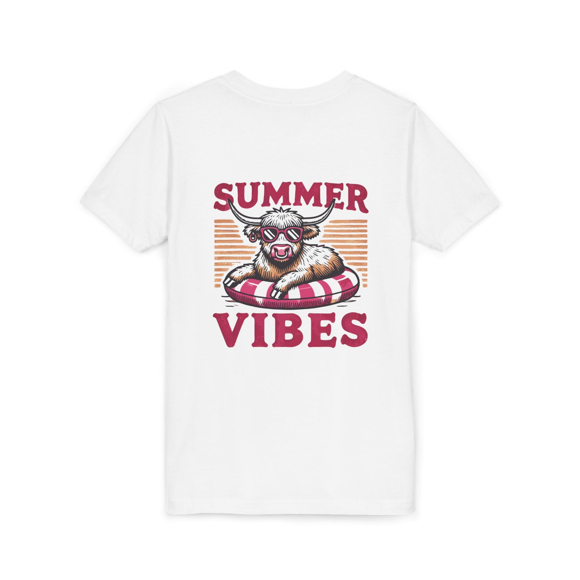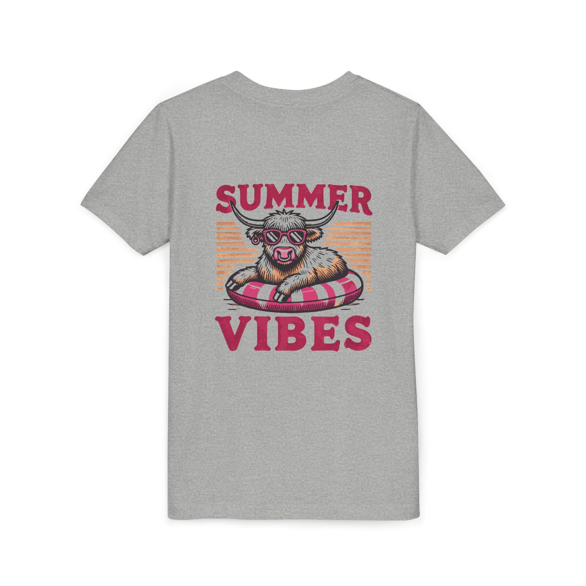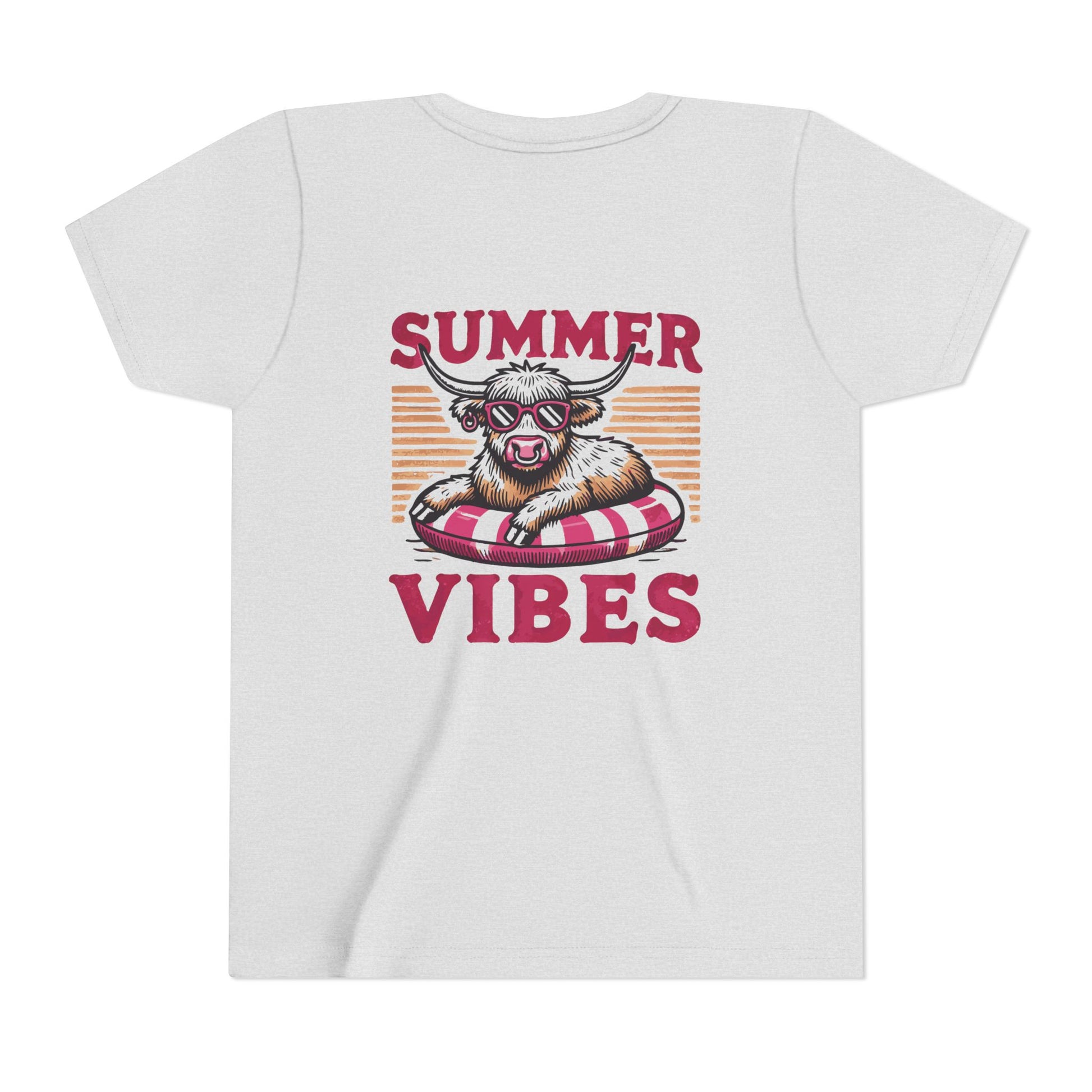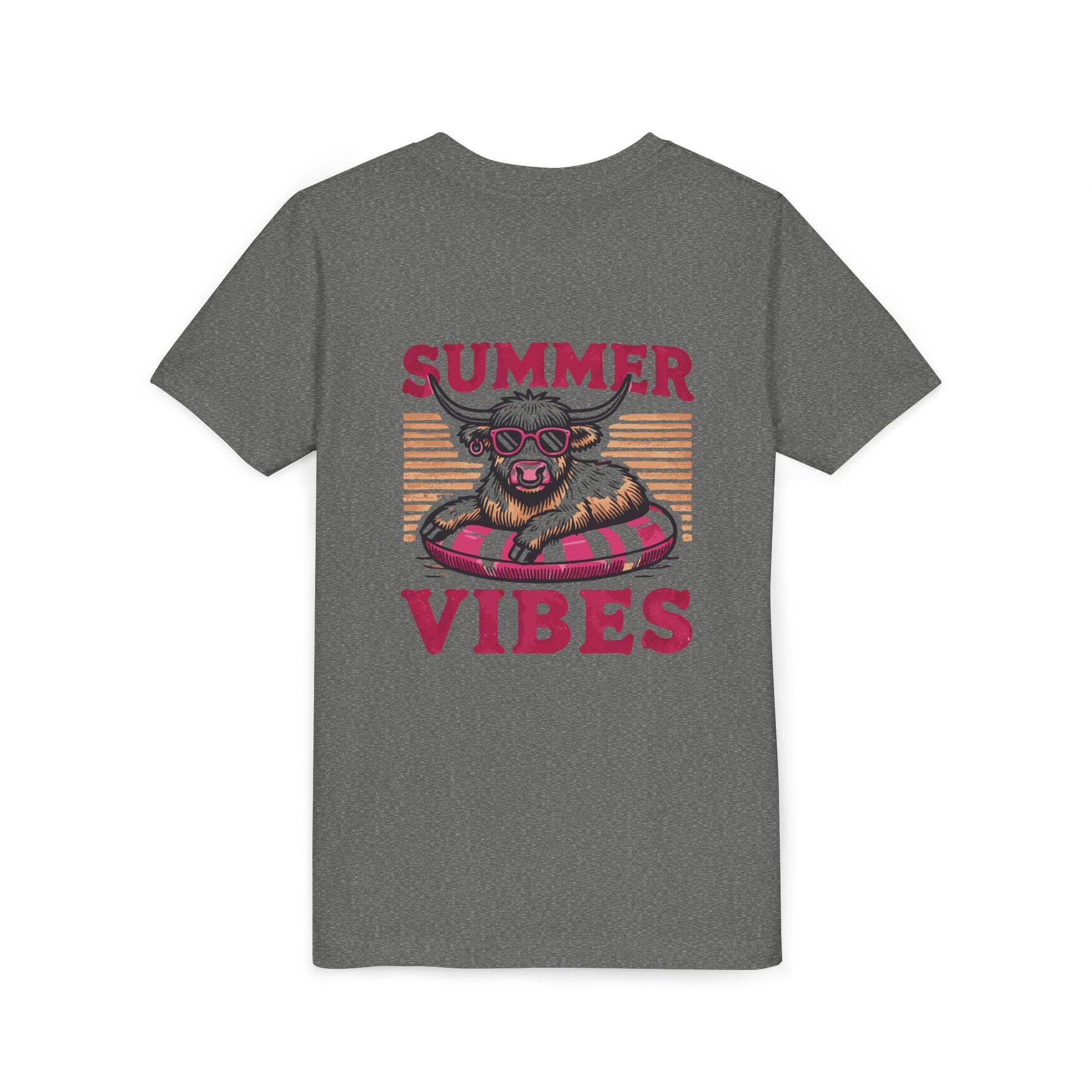 "Kick back and soak up the sunshine with our 'Summer Vibes' tee! Featuring a chill cow lounging on an inflatable, it's your perfect partner for lazy days and breezy adventures. Embrace the moo-d of the season!" will love this custom youth short-sleeve tee. This lightweight side-seamed shirt maximizes comfort all day long. The ring-spun cotton makes this kids' short-sleeved tee perfect for displaying custom artwork. Side seams keep the garment's shape. The shoulders have tape for longer fitting. The collar is extra elastic due to ribbed knitting.