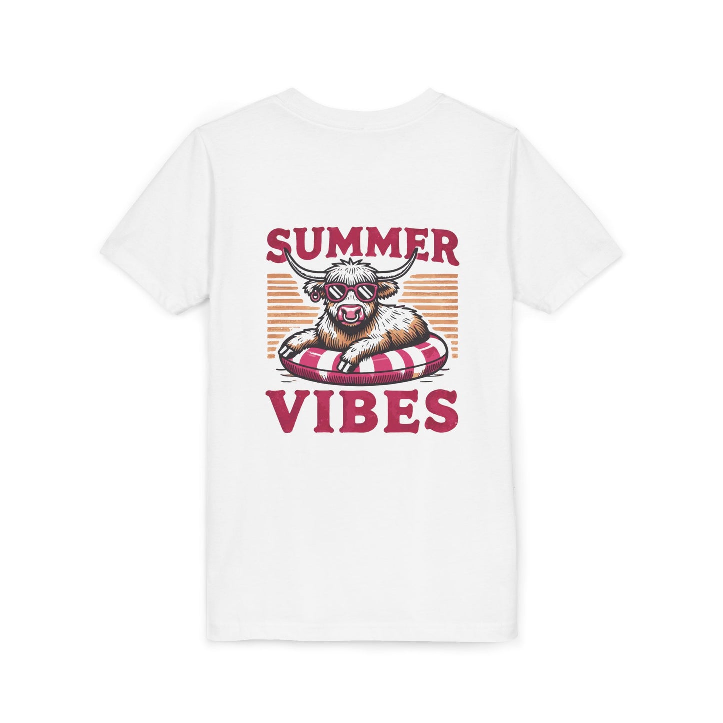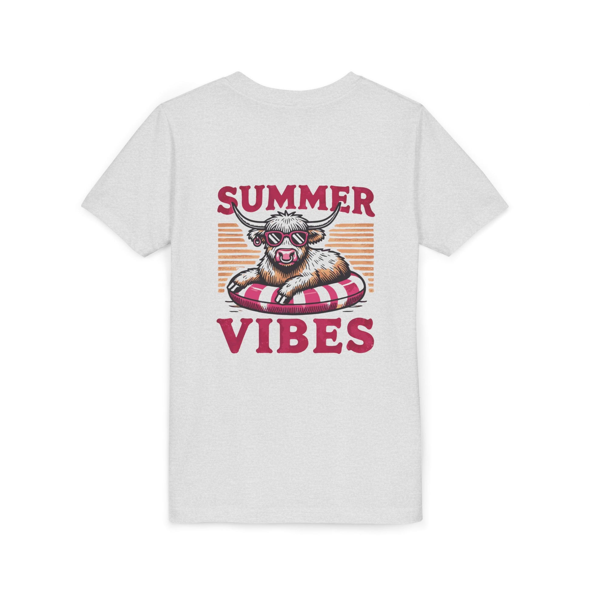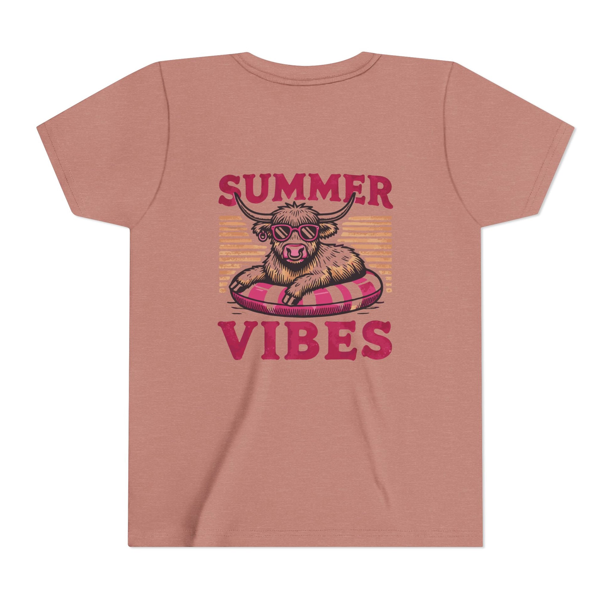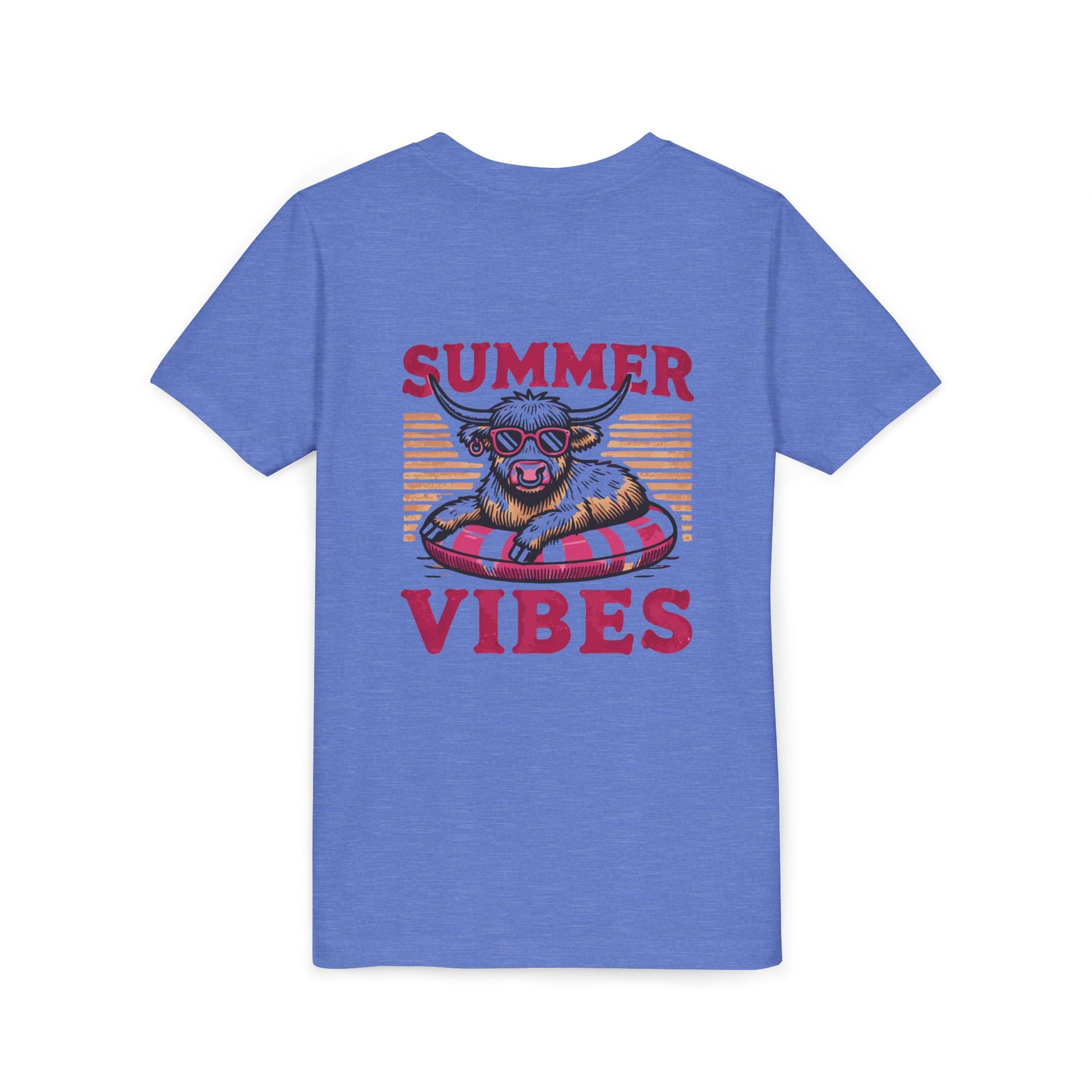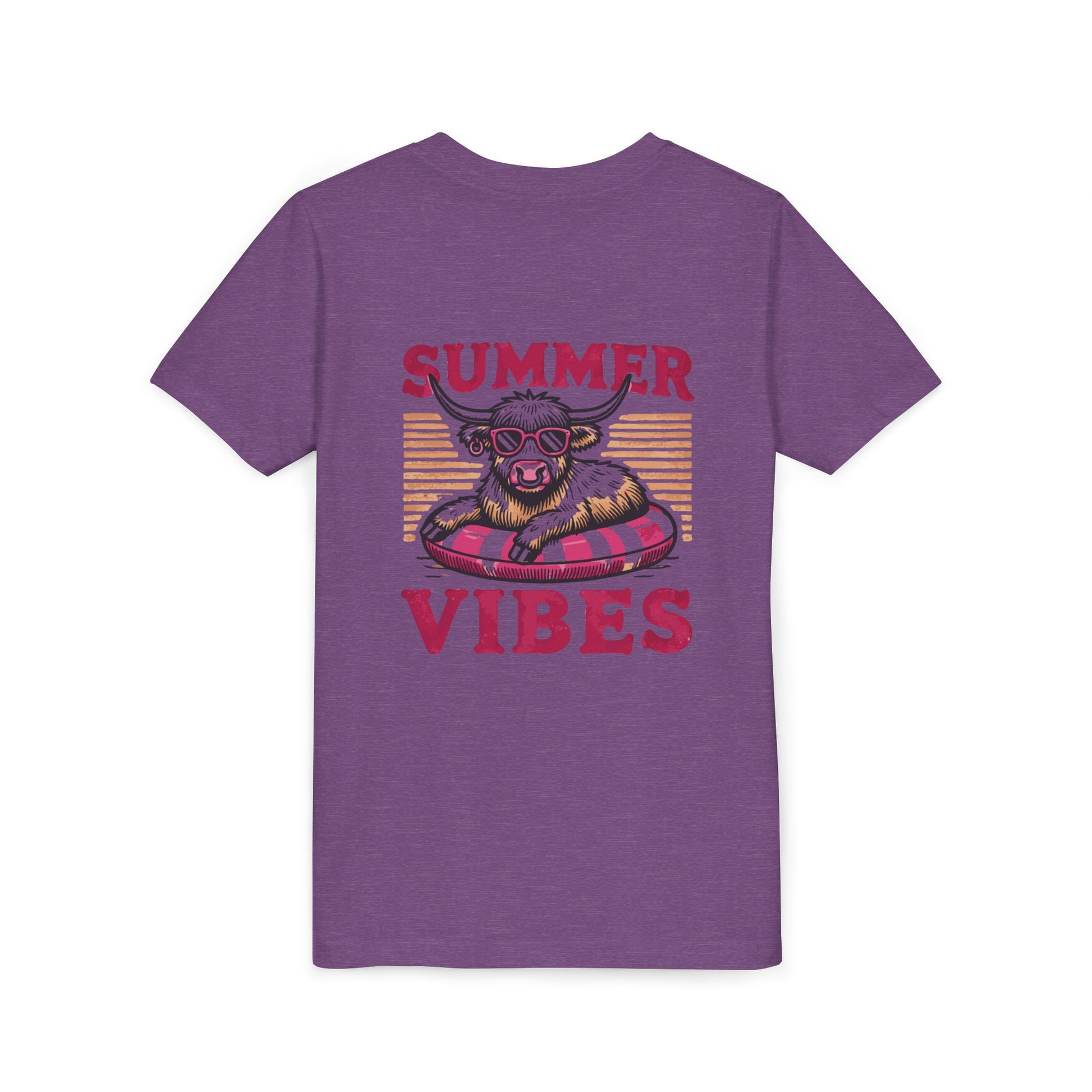 "Kick back and soak up the sunshine with our 'Summer Vibes' tee! Featuring a chill cow lounging on an inflatable, it's your perfect partner for lazy days and breezy adventures. Embrace the moo-d of the season!" will love this custom youth short-sleeve tee. This lightweight side-seamed shirt maximizes comfort all day long. The ring-spun cotton makes this kids' short-sleeved tee perfect for displaying custom artwork. Side seams keep the garment's shape. The shoulders have tape for longer fitting. The collar is extra elastic due to ribbed knitting.