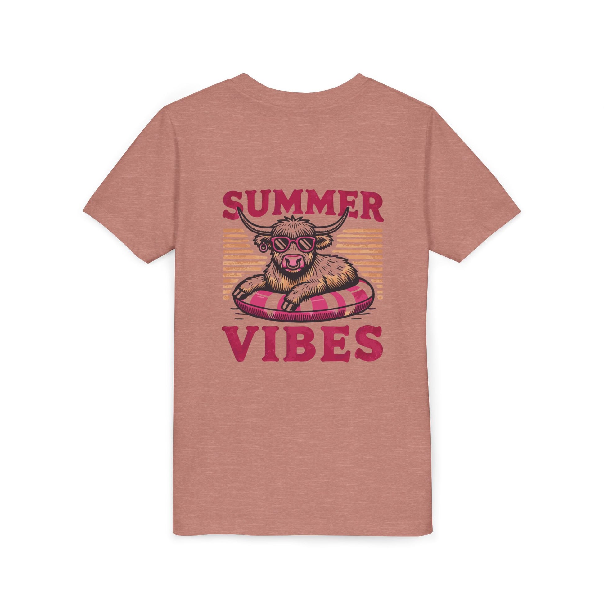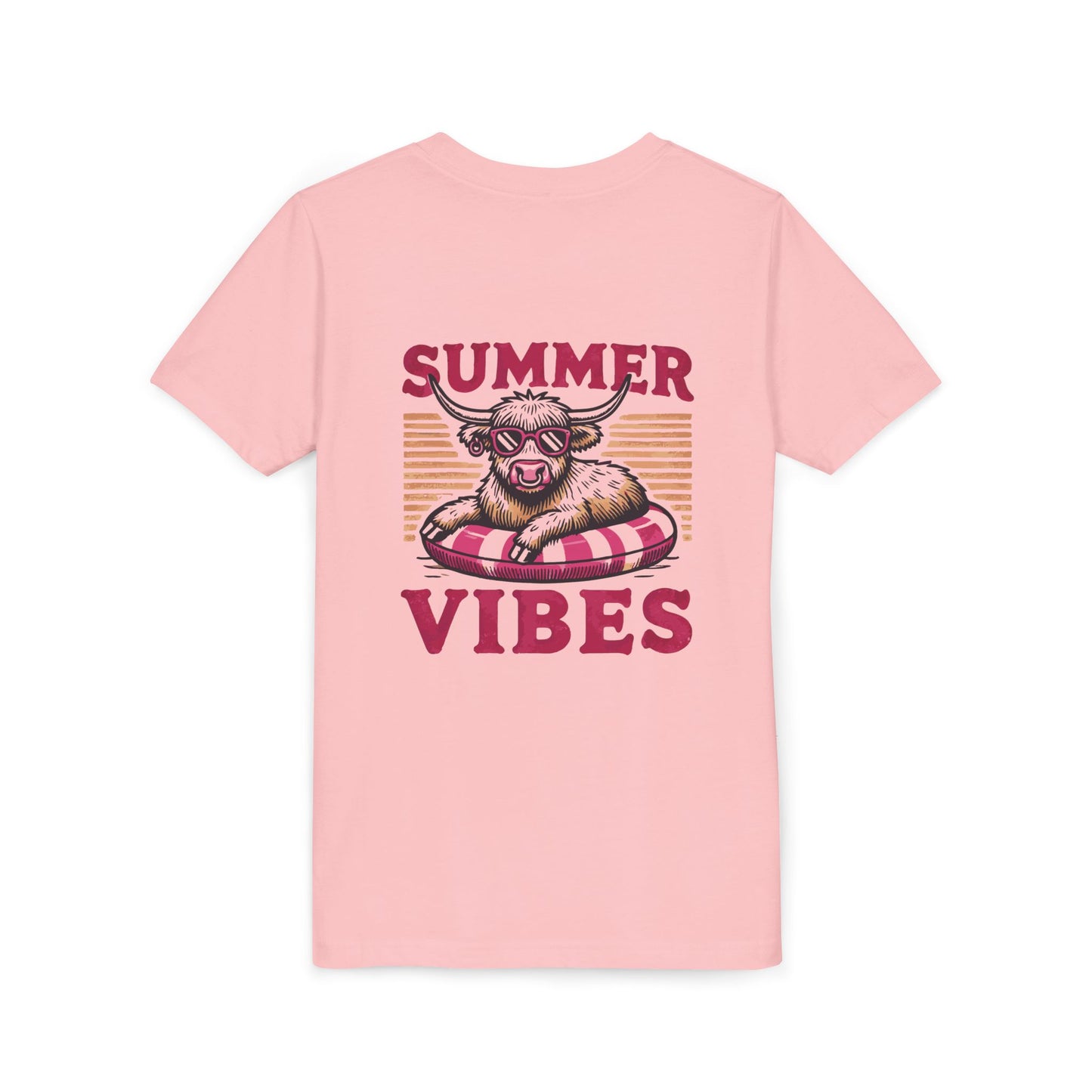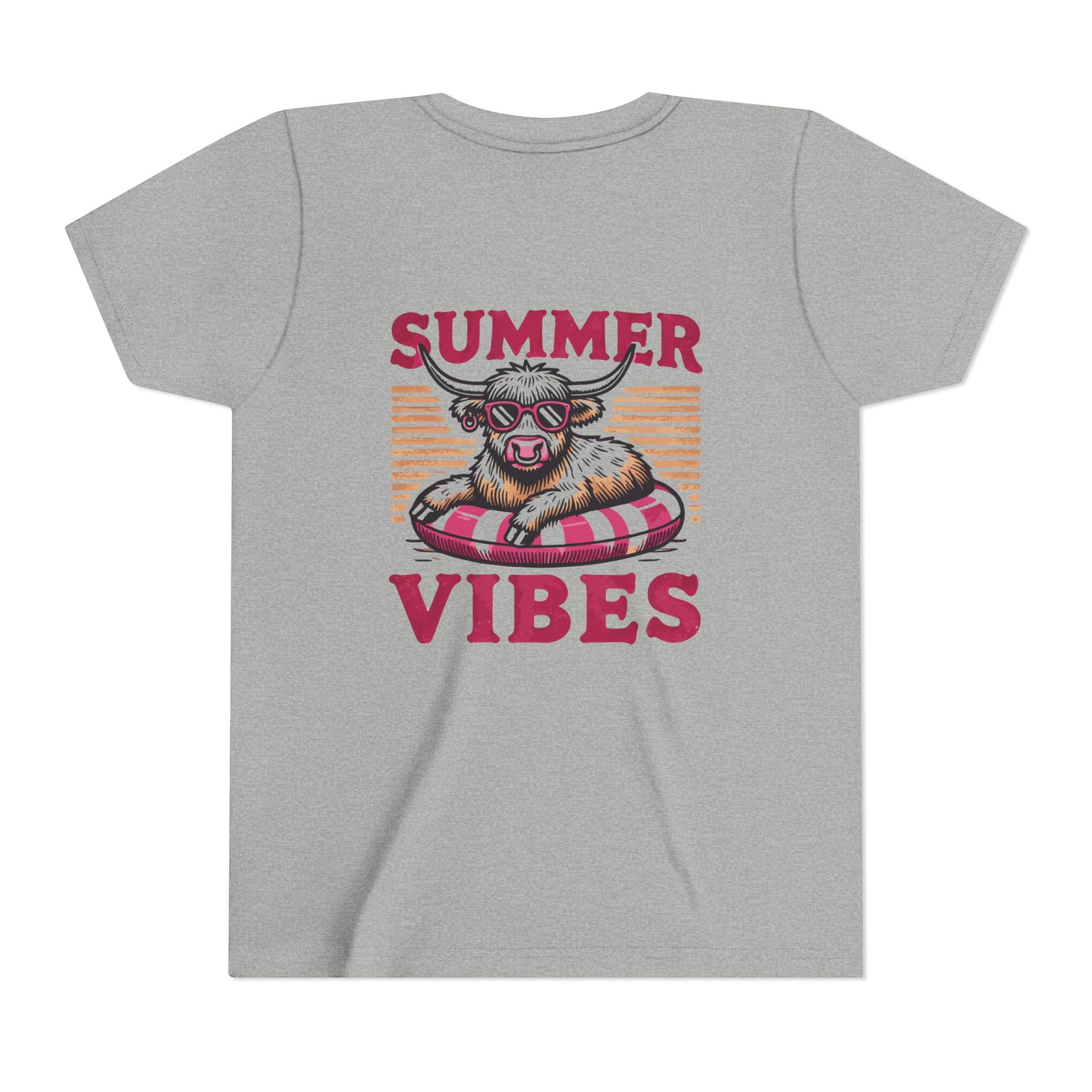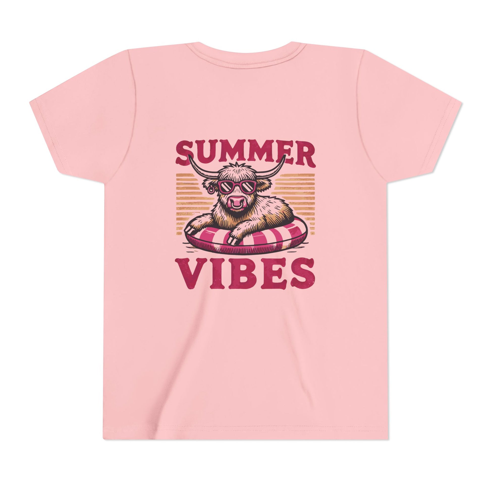 "Kick back and soak up the sunshine with our 'Summer Vibes' tee! Featuring a chill cow lounging on an inflatable, it's your perfect partner for lazy days and breezy adventures. Embrace the moo-d of the season!" will love this custom youth short-sleeve tee. This lightweight side-seamed shirt maximizes comfort all day long. The ring-spun cotton makes this kids' short-sleeved tee perfect for displaying custom artwork. Side seams keep the garment's shape. The shoulders have tape for longer fitting. The collar is extra elastic due to ribbed knitting.